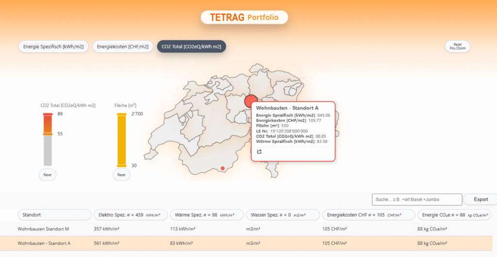 Dans l’exemple de démonstration (capture d’écran), le site se distingue par des émissions de CO₂ par m² élevées (voir capture d’écran). De tels exemples pratiques montrent comment l’optimisation des temps de fonctionnement permet de réduire sensiblement les coûts et les émissions. Vous trouverez d’autres exemples de réussite sur tetrag.ch → Histoires de réussite.
