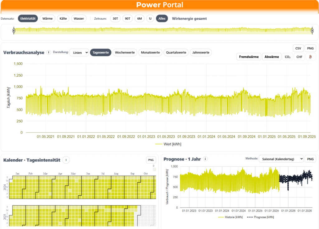 Les courbes journalières et hebdomadaires indiquent l’activité, le calendrier affiche les intensités journalières des jours ouvrables et des week-ends. Les cartes thermiques montrent les tendances au cours du mois, les analyses détaillées permettent de passer de la vue du portefeuille au compteur individuel. Les courbes prévisionnelles aident à planifier de manière réaliste l’hiver suivant et à traiter rapidement les écarts budgétaires. La visualisation dans le Power Portal permet de réaliser des économies concrètes en matière de consommation d’énergie et facilite les tâches dans les domaines du conseil en énergie, de la gestion environnementale et de l’économie en favorisant les décisions basées sur les données. Moins de clics, plus de clarté : cela permet de gagner du temps dans le reporting et les demandes de renseignements.